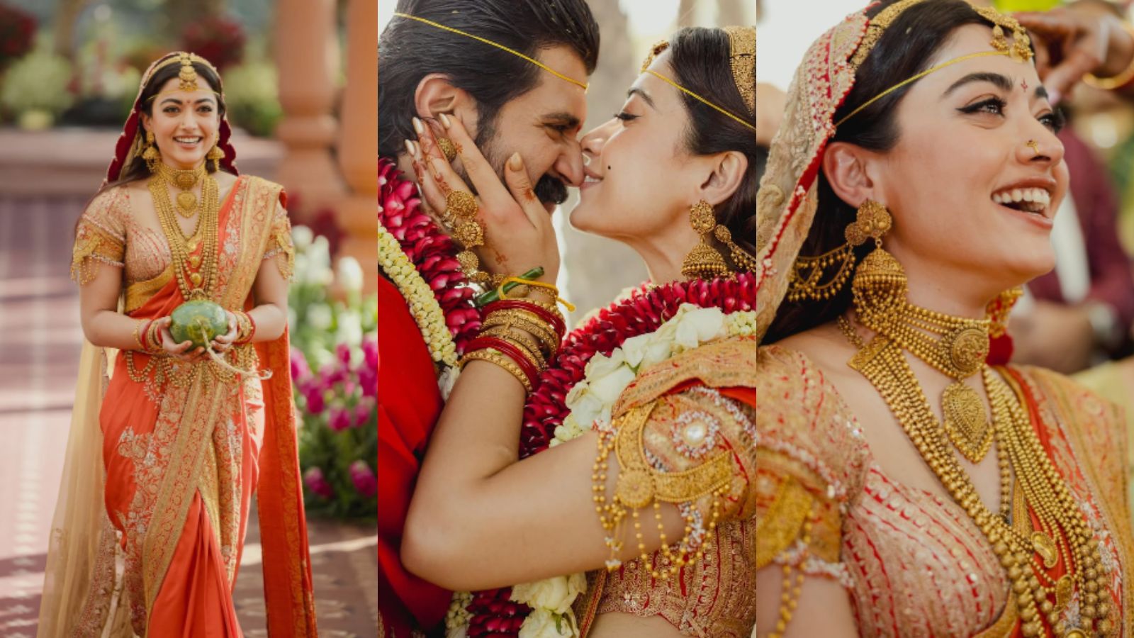 Rashmika Mandanna’s wedding photos(a long-awaited “Virosh” union with Vijay Deverakonda) have sent the internet into a tailspin. Draped in a rich rust, red, and gold saree, Rashmika rejected the minimalist trend in favour of a regal look.